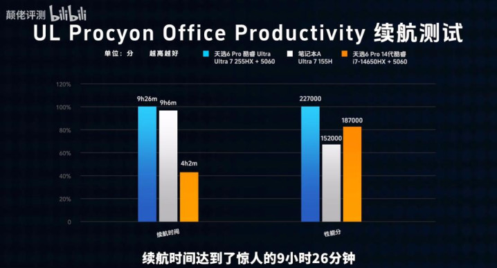 同时,在办公软件续航测试中,华硕天选6 Pro的续航成绩达到了9小时26分钟。这样的表现放在以往主打高性能的游戏本中,无疑相当亮眼,充分展现了英特尔酷睿Ultra 7处理器255HX在能效优化方面的巨大进步。