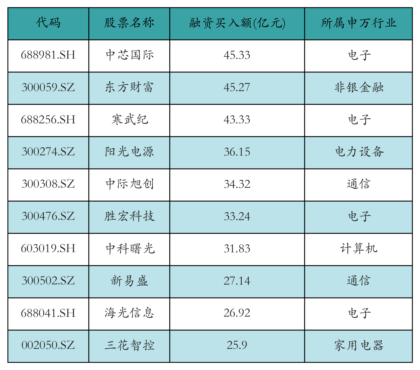 两市共有3447只个股有融资资金买入,其中中芯国际、东方财富、寒武纪排名前三,买入金额分别45.33亿元、45.27亿元、43.33亿元。融资买入额前10个股详情见下表: