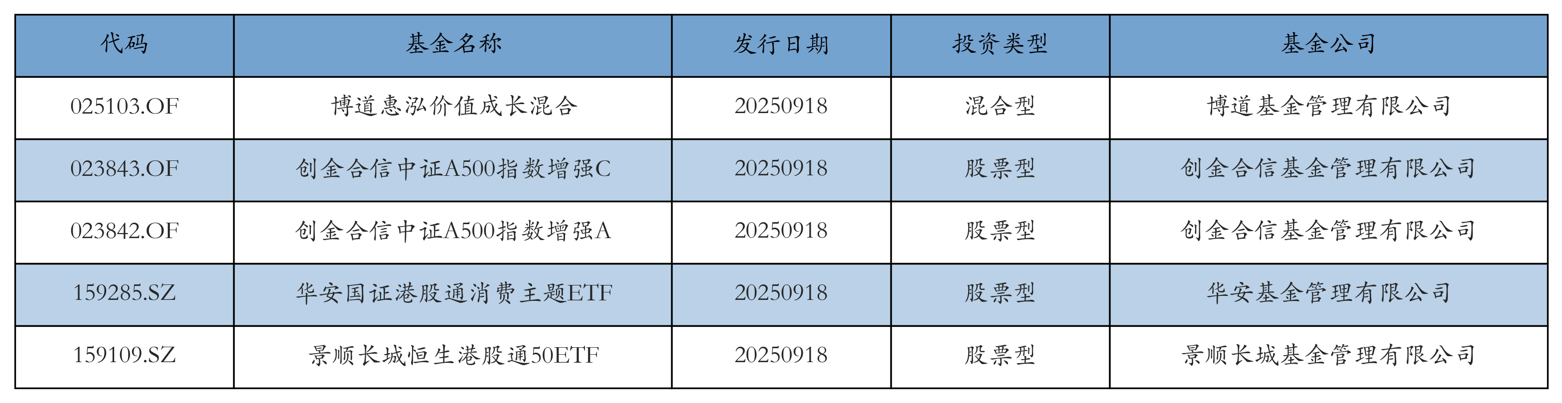 昨日有5只新基金发行,分别为:博道惠泓价值成长混合、创金合信中证A500指数增强C、创金合信中证A500指数增强A、华安国证港股通消费主题ETF、景顺长城恒生港股通50ETF,详情见下表: