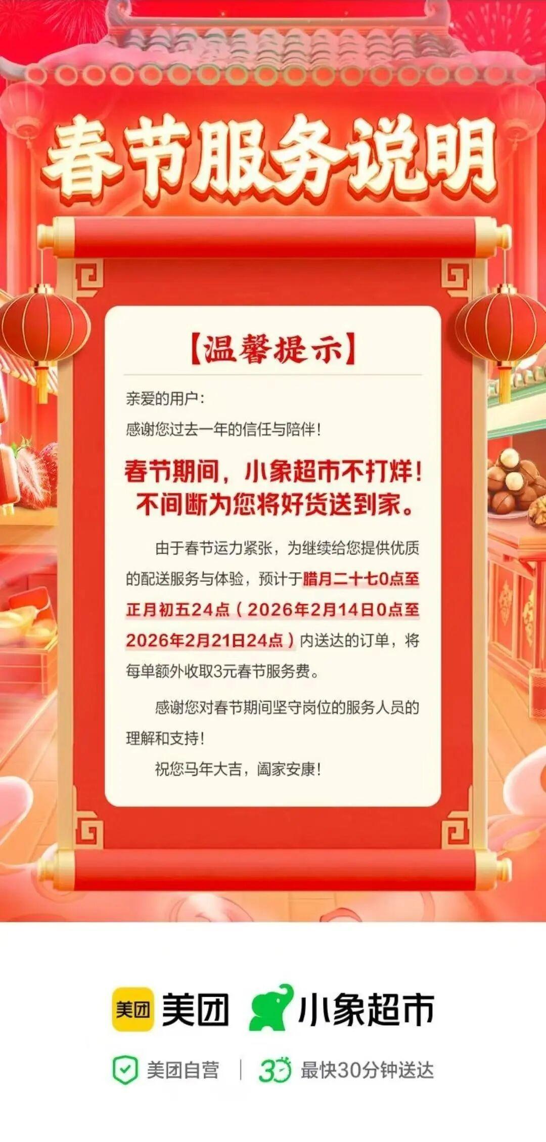叮咚买菜从2月15日0点至2月21日24点每单额外收取3元春节服务费。美团小象超市在2月14日0点至2月21日24点内配送的订单,每单额外收取3元春节服务费。